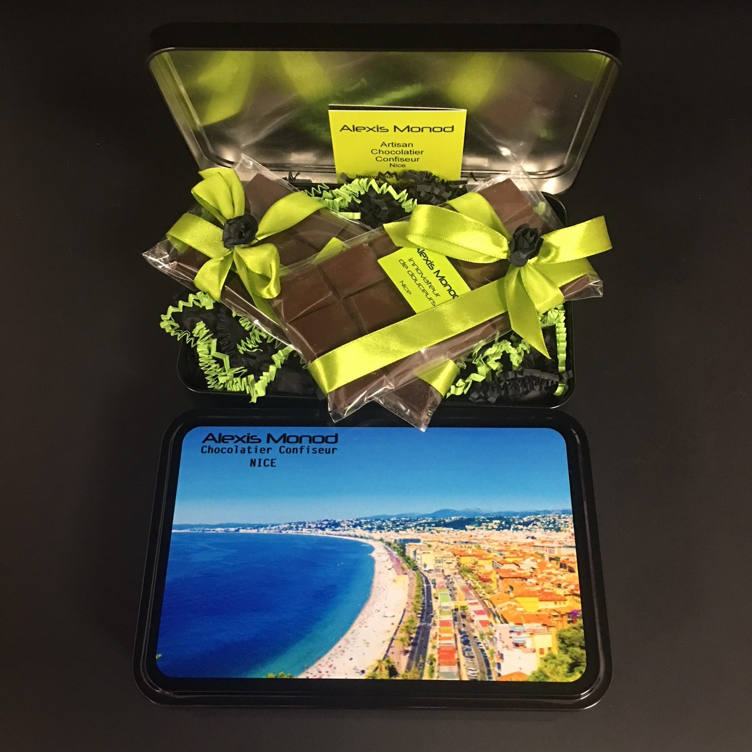 Un hommage gourmand à l’avenue la plus célèbre de la Côte d’Azur. La boîte « Promenade des Anglais » renferme deux tablettes artisanales composées avec soin dans l’atelier du Vieux-Nice par Alexis Monod : une tablette chocolat noir Côte d’Ivoire et une tablette chocolat lait Côte d’Ivoire. Un écrin élégant aux couleurs de Nice, idéal pour se faire plaisir ou offrir un souvenir inoubliable aux saveurs raffinées. Livraison rapide dans toute la France.