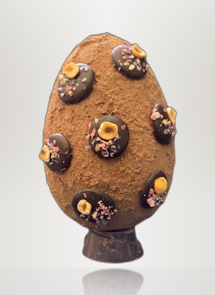 L’élégance brute du cacao sublimée par la générosité des fruits. L’œuf « Mendiants » est élaboré à la main dans l’atelier du Vieux-Nice, enrobé d’un voile de cacao et orné de mendiants au chocolat noir parsemés de noisettes torréfiées et d’éclats de fruits confits aux couleurs éclatantes. Garni de douceurs artisanales, il allie intensité et raffinement à chaque bouchée. Disponible en boutique et en livraison sur Nice et ses alentours.