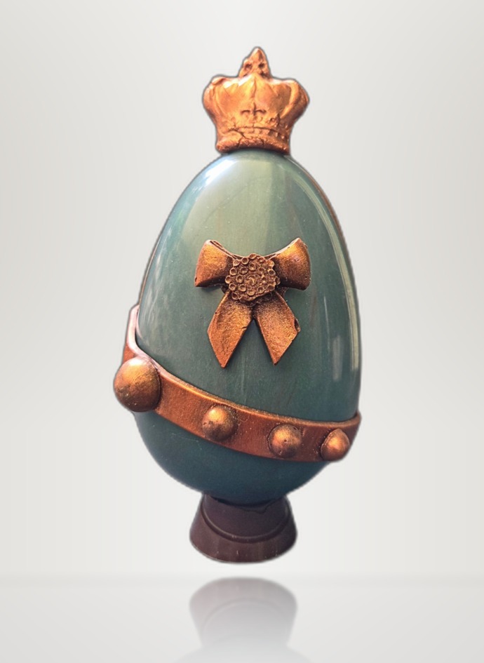 La noblesse du chocolat artisanal élevée au rang d’œuvre. L’œuf « Roi » est une création d’exception façonnée à la main dans l’atelier du Vieux-Nice, paré d’un élégant émail bleu canard, d’une ceinture dorée et couronné d’un nœud en chocolat bronze d’une finesse remarquable. En chocolat noir grand cru ou au lait, il est garni de douceurs artisanales choisies avec soin. Disponible en boutique et en livraison sur Nice et ses alentours.