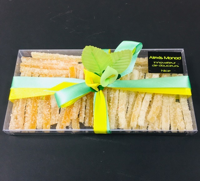 Un duo de fruits confits pour les amateurs d’originalité. Des orangettes citronettes confites avec un brin d’amertume qui s’évapore sous les cristaux de sucre. Un bonheur que l’on ne peut s’empêcher de savourer avec bonheur et à partager en famille tout au long de la journée.