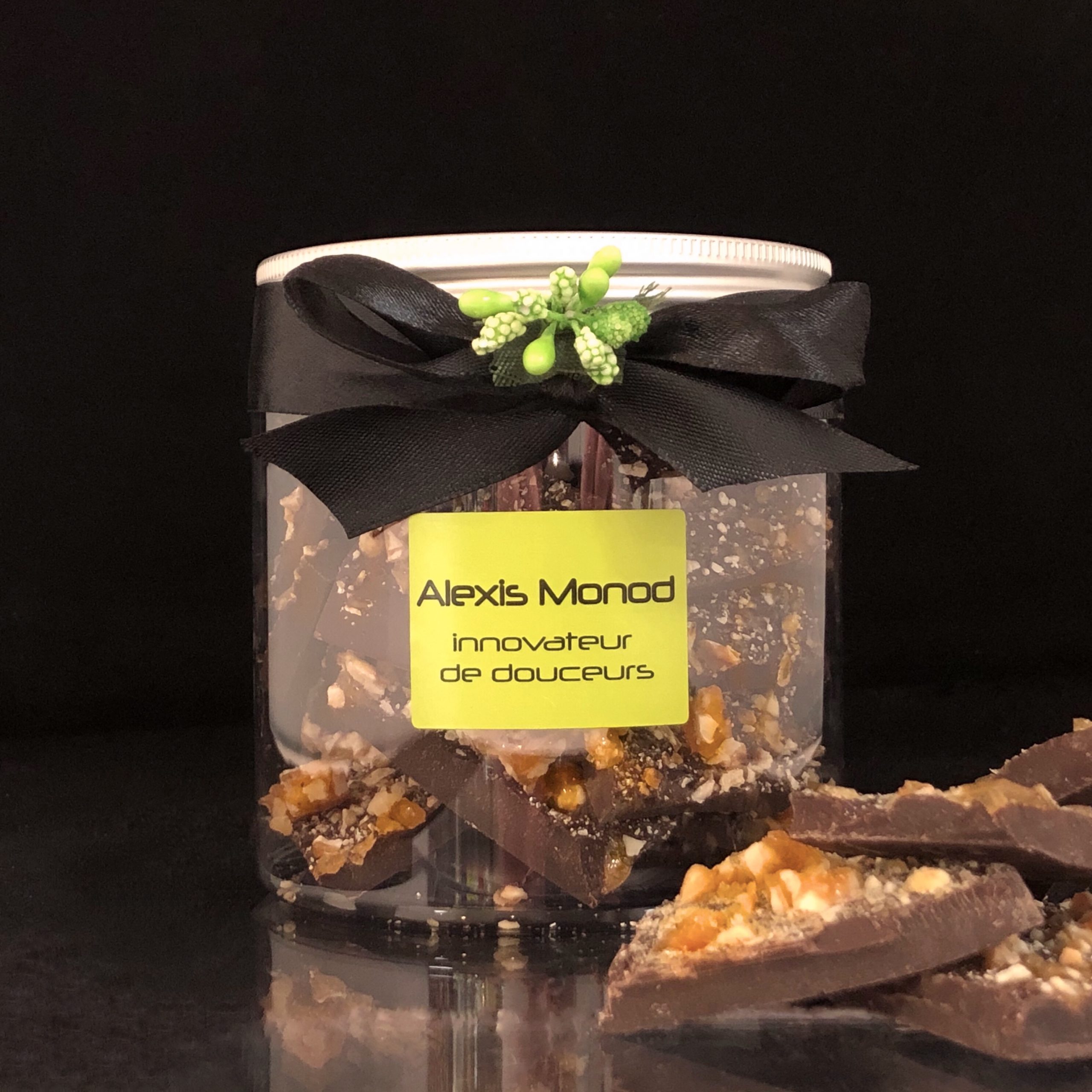 Chez Alexis Monod, chaque tablette est le fruit d’un savoir-faire raffiné et minutieux. Est choisis pour son intensité et sa légère amertume. Il est ensuite associé à des éclats de nougatine maison, préparée à partir de noisettes de qualité, torréfiées et caramélisées pour créer une texture parfaitement croquante.