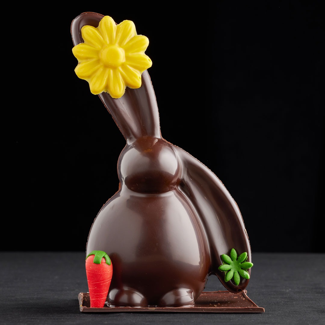 Découvrez notre création spéciale Fêtes de Pâques : Le Lapin en chocolat noir ou lait et sa pâquerette