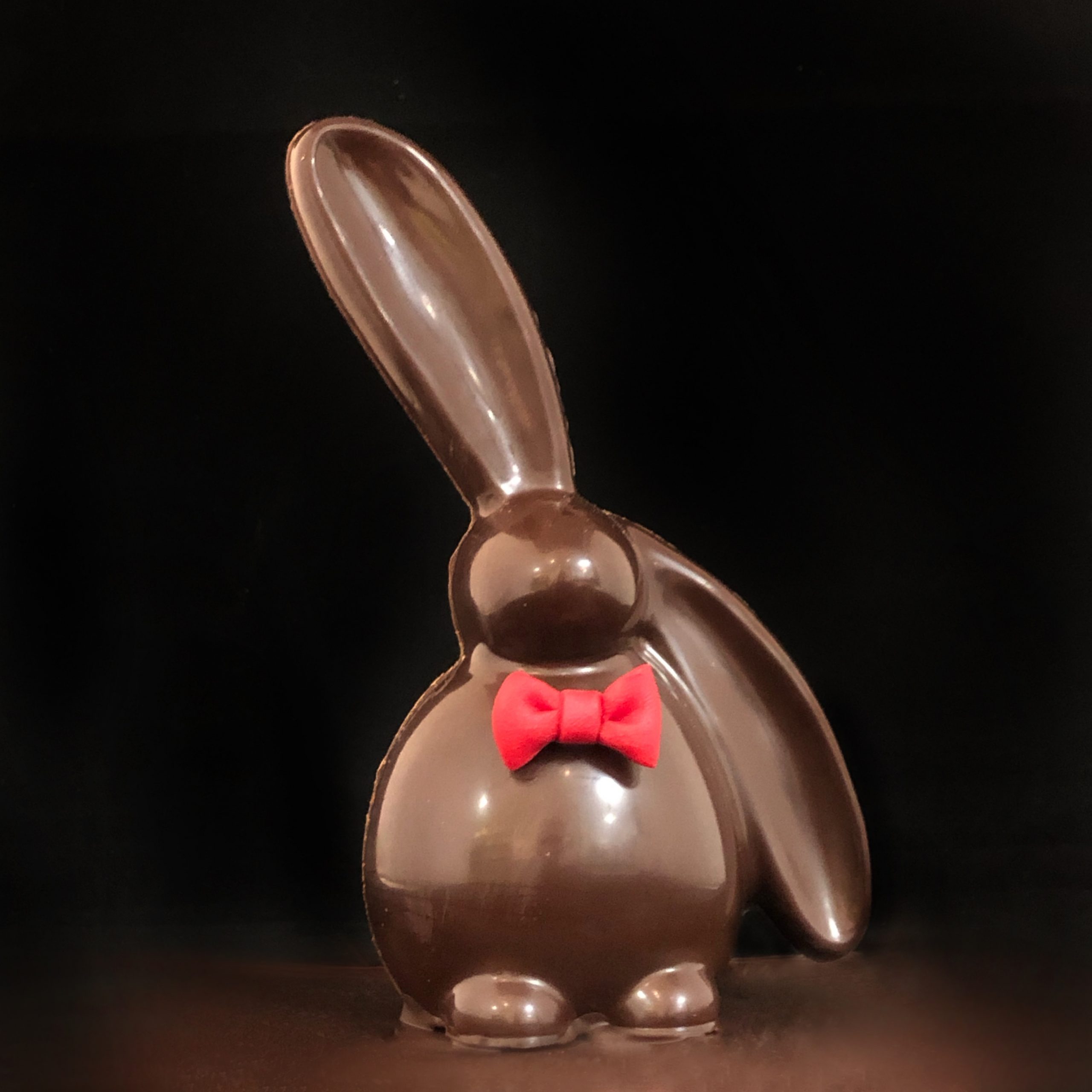 Le design de ce lapin en chocolat joue avec les codes classiques tout en y apportant une touche d’humour. Ses oreilles, l’une dressée comme pour écouter un secret, et l’autre retombant avec nonchalance, lui donnent une personnalité unique. Ce nœud papillon rouge vif, tout en contraste avec la couleur du chocolat, ajoute une touche de gaieté et de raffinement. Ce lapin, amusant et élégant à la fois, est un véritable complice de printemps. Il nous rappelle que même dans les moments les plus simples, un sourire, une touche de couleur et un peu de fantaisie peuvent transformer une journée ordinaire en un moment magique.