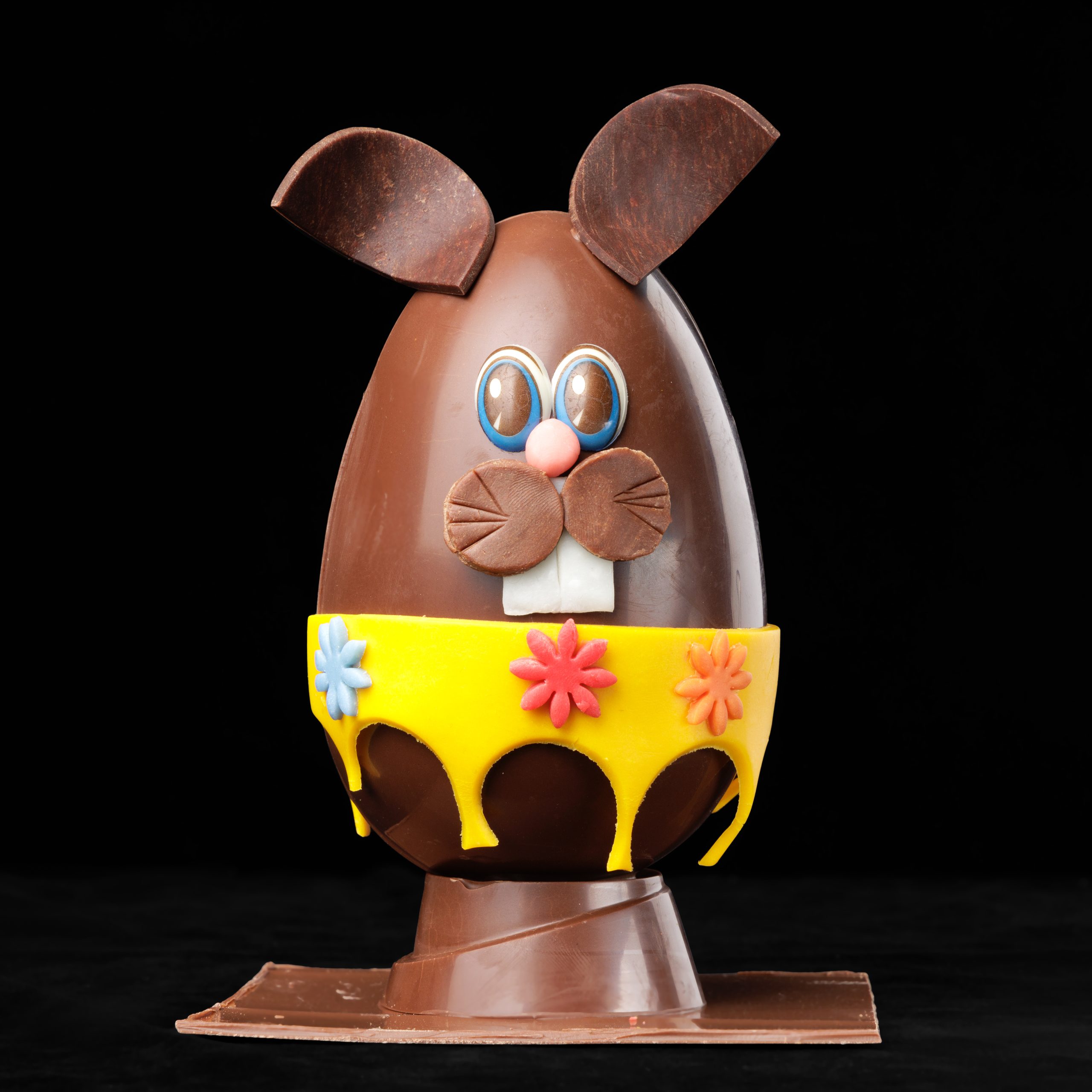 Laissez-vous charmer par notre lapin en jupe garni en chocolat. Une célébration du printemps et des beaux jours. Ce lapin chocolaté incarne l’esprit joyeux de la saison, avec ses couleurs éclatantes et son look pétillant. Sa jupe jaune aux motifs floraux évoque le soleil, les fleurs épanouies et l’arrivée des chaleurs. Parfait pour apporter une touche de gaieté à vos fêtes de Pâques ou à toute autre occasion printanière, ce lapin malin est un véritable délice