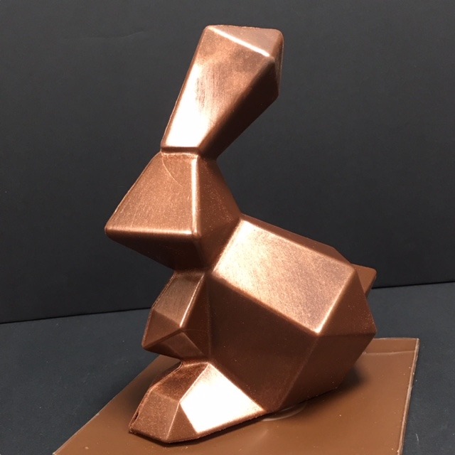 Le Lapin garni cuivré en chocolat noir ou chocolat au lait est une création très originale. Sa forme minimaliste et épurée, son manteau cuivré et ses lignes géométrique sont dignes d’une sculpture contemporaine.