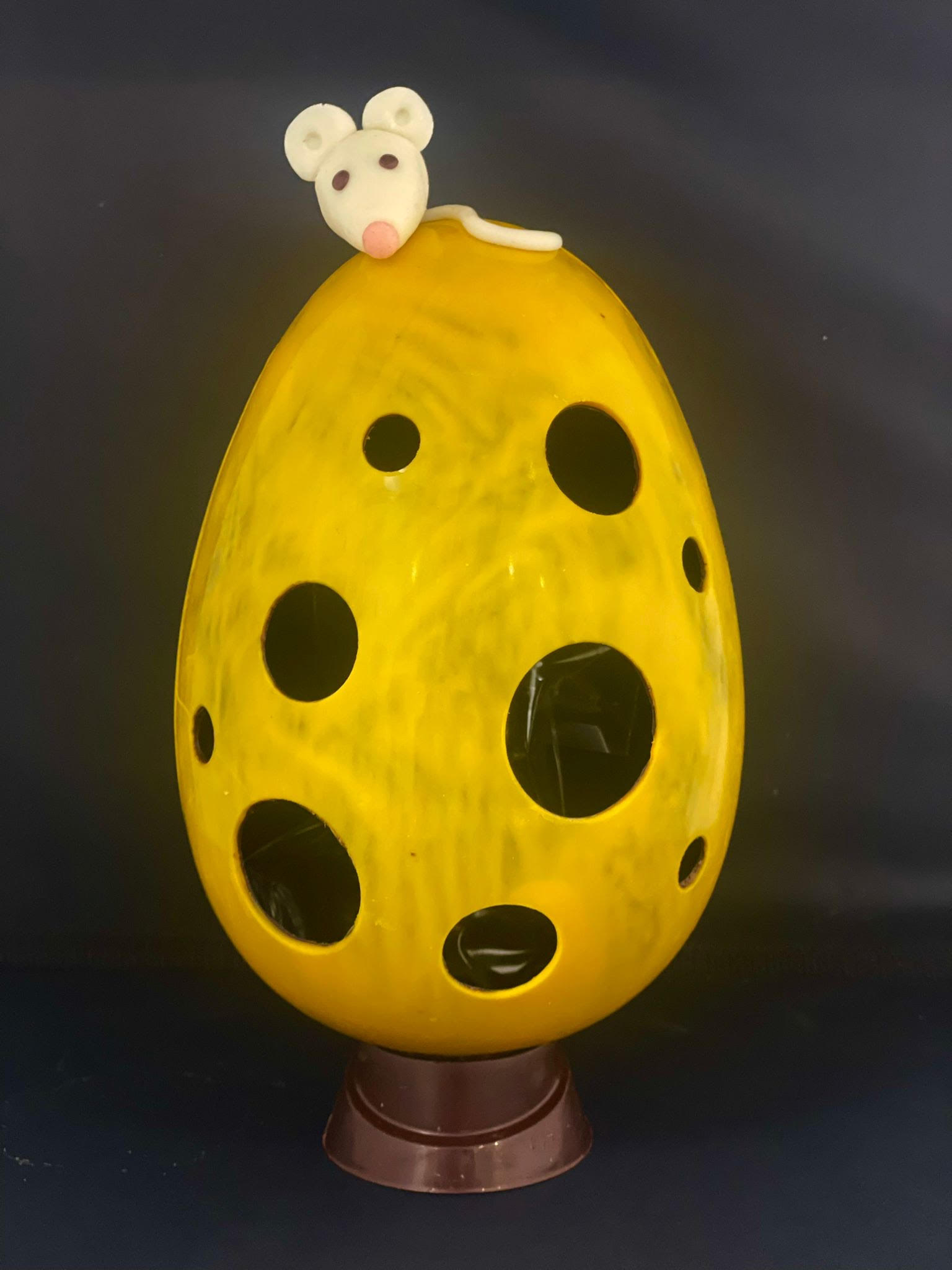 Par ailleurs l’inspiration pour ce design particulier provient de l’image iconique du fromage de gruyère. Il est associé à la convivialité et à la dégustation . La petite souris placée au sommet de l’œuf ajoute une touche espiègle à l’ensemble. Ceci évoquant l’idée de la petite créature curieuse qui aurait pu grignoter quelques trous dans ce délicieux œuf de Pâques.