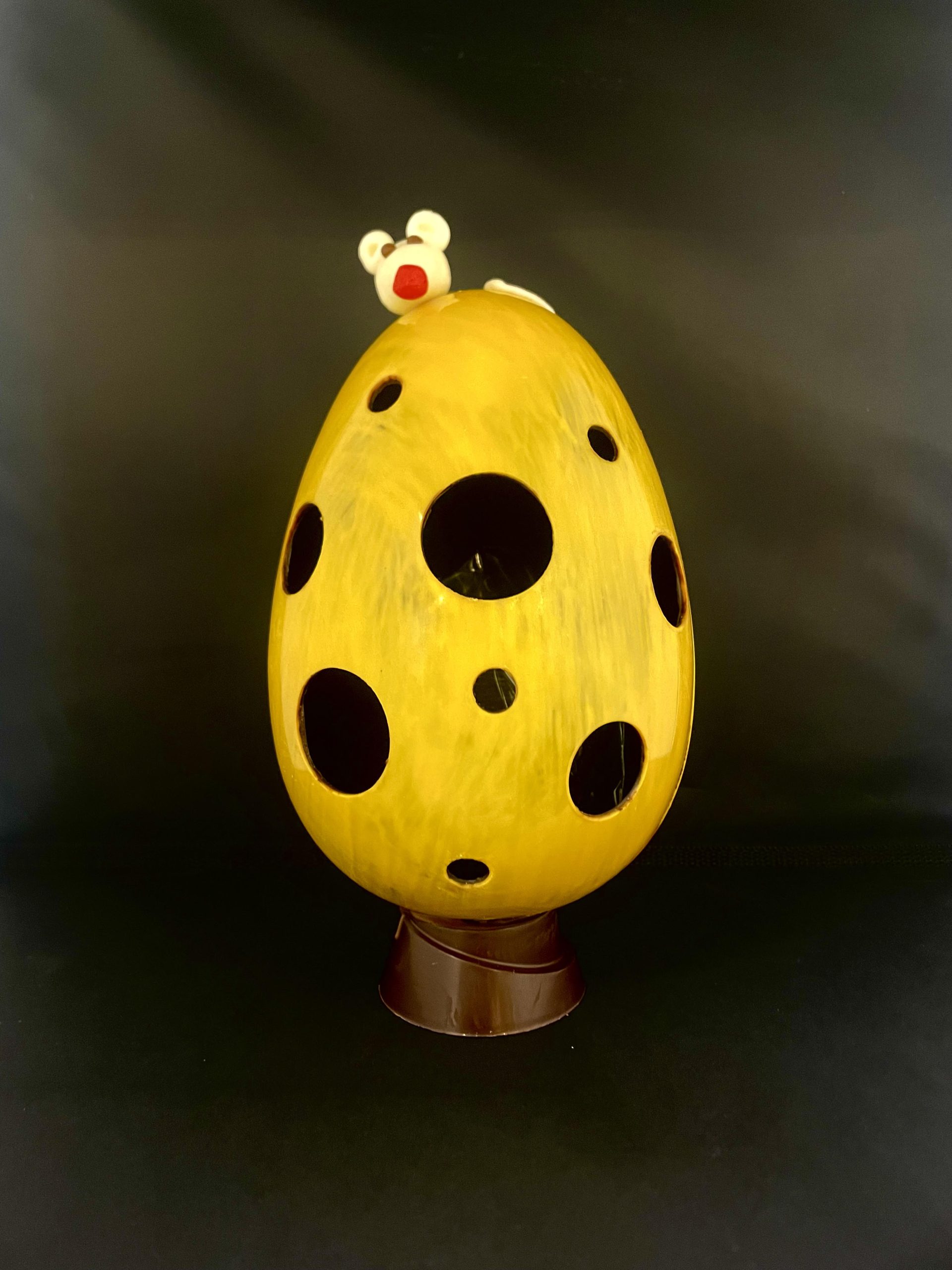 Par ailleurs l’inspiration pour ce design particulier provient de l’image iconique du fromage de gruyère. Il est associé à la convivialité et à la dégustation . La petite souris placée au sommet de l’œuf ajoute une touche espiègle à l’ensemble. Ceci évoquant l’idée de la petite créature curieuse qui aurait pu grignoter quelques trous dans ce délicieux œuf de Pâques.