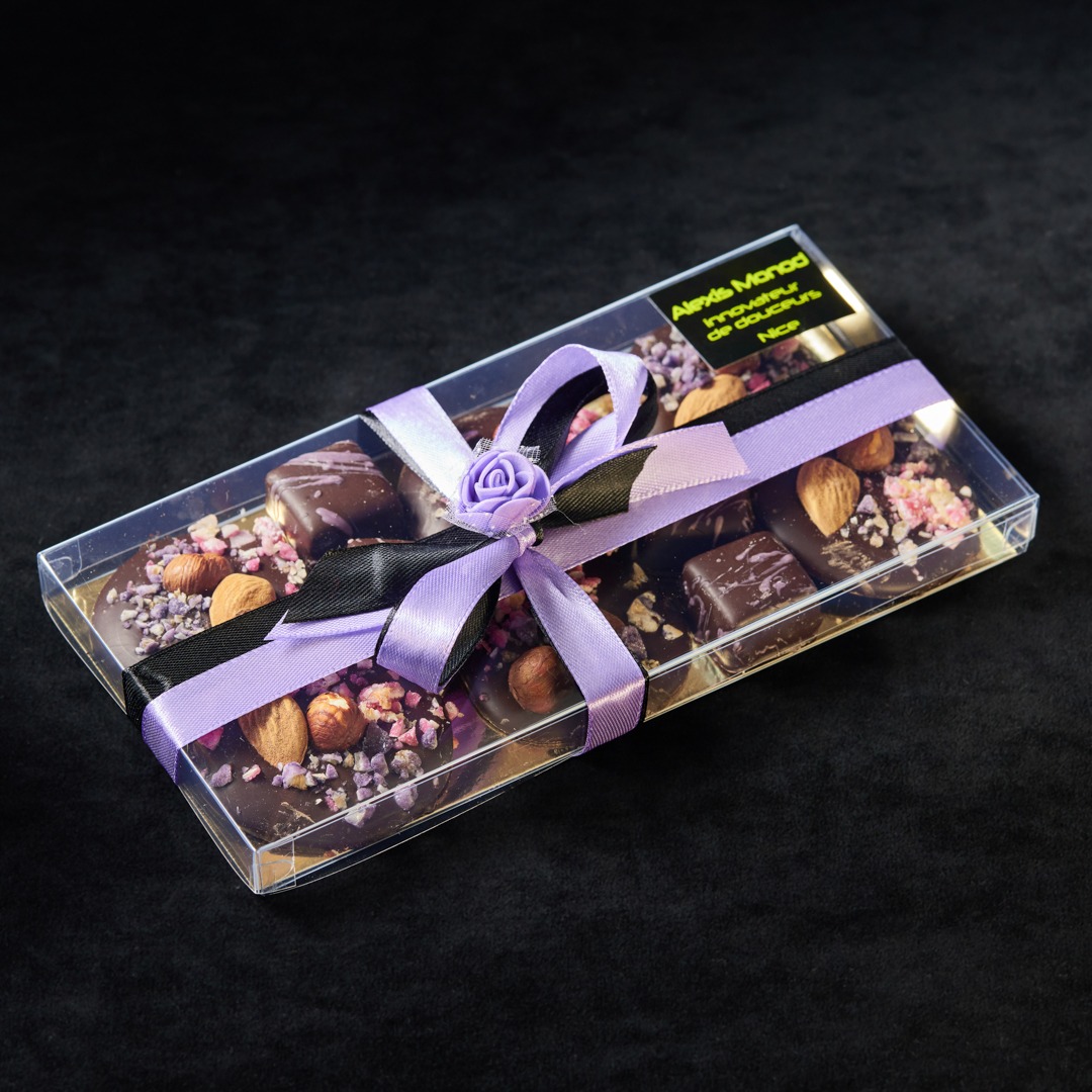 Nos mendiants au chocolat noir fleurs sont une véritable merveille qu’il faut goûter ! Du chocolat noir intense, des amandes et des noisettes torréfiées composent ces mendiants. C’est pourquoi, ils offrent une expérience si riche en saveurs. Les fleurs de rose et violette cristallisées de Tourettes-sur-Loup ajoutent une touche florale unique.