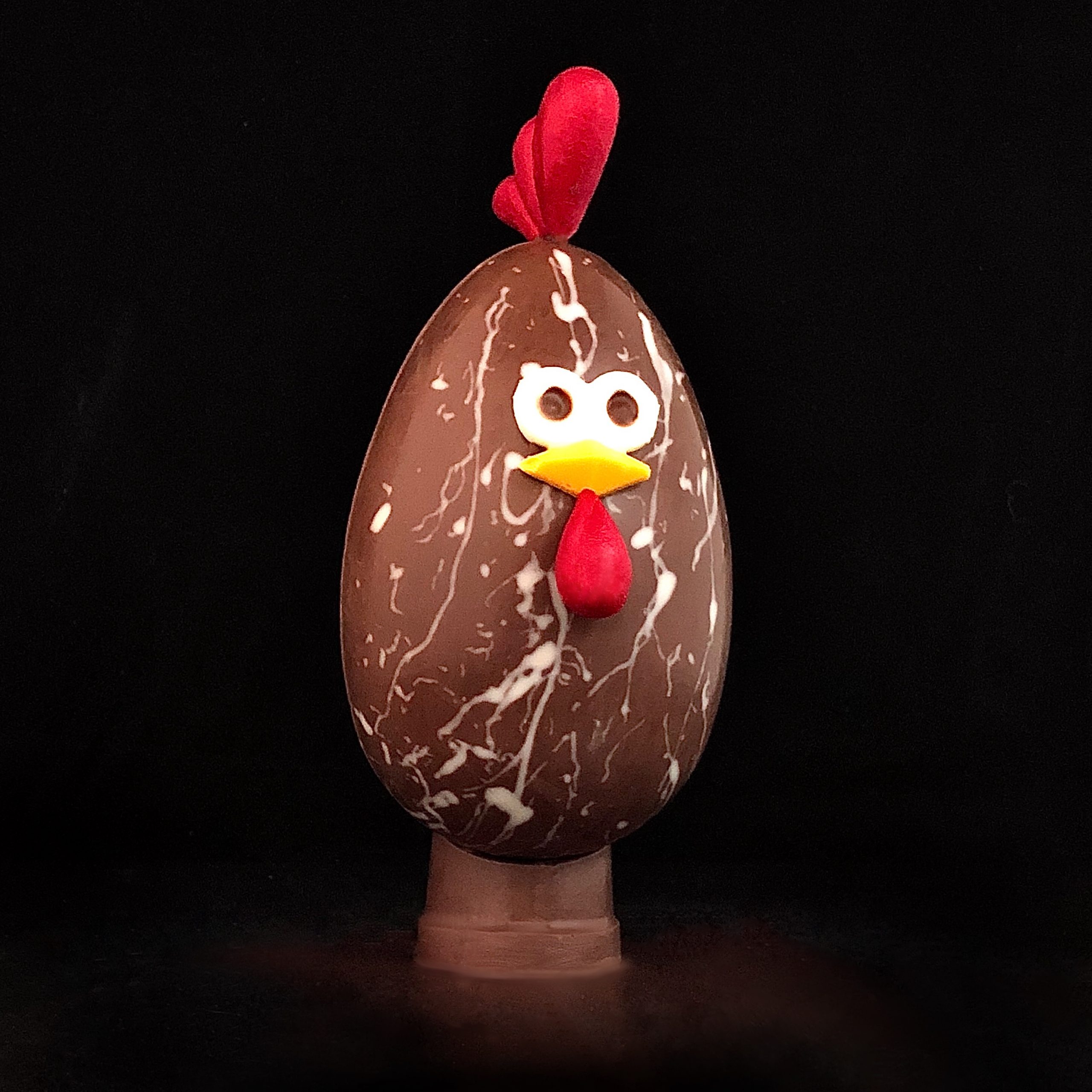 Découvrez notre création spéciale Fêtes de Pâques : L’Œuf chocolat noir ou lait « Coq contemporain »