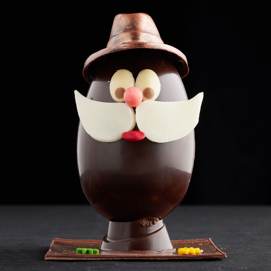 L’œuf cow-boy en chocolat, qu’il soit noir ou au lait, est une aventure à savourer. Avec son chapeau et sa très grande moustache blanche, il a l’air amusant d’un cow-boy, tout en apportant une touche de gourmandise irrésistible.