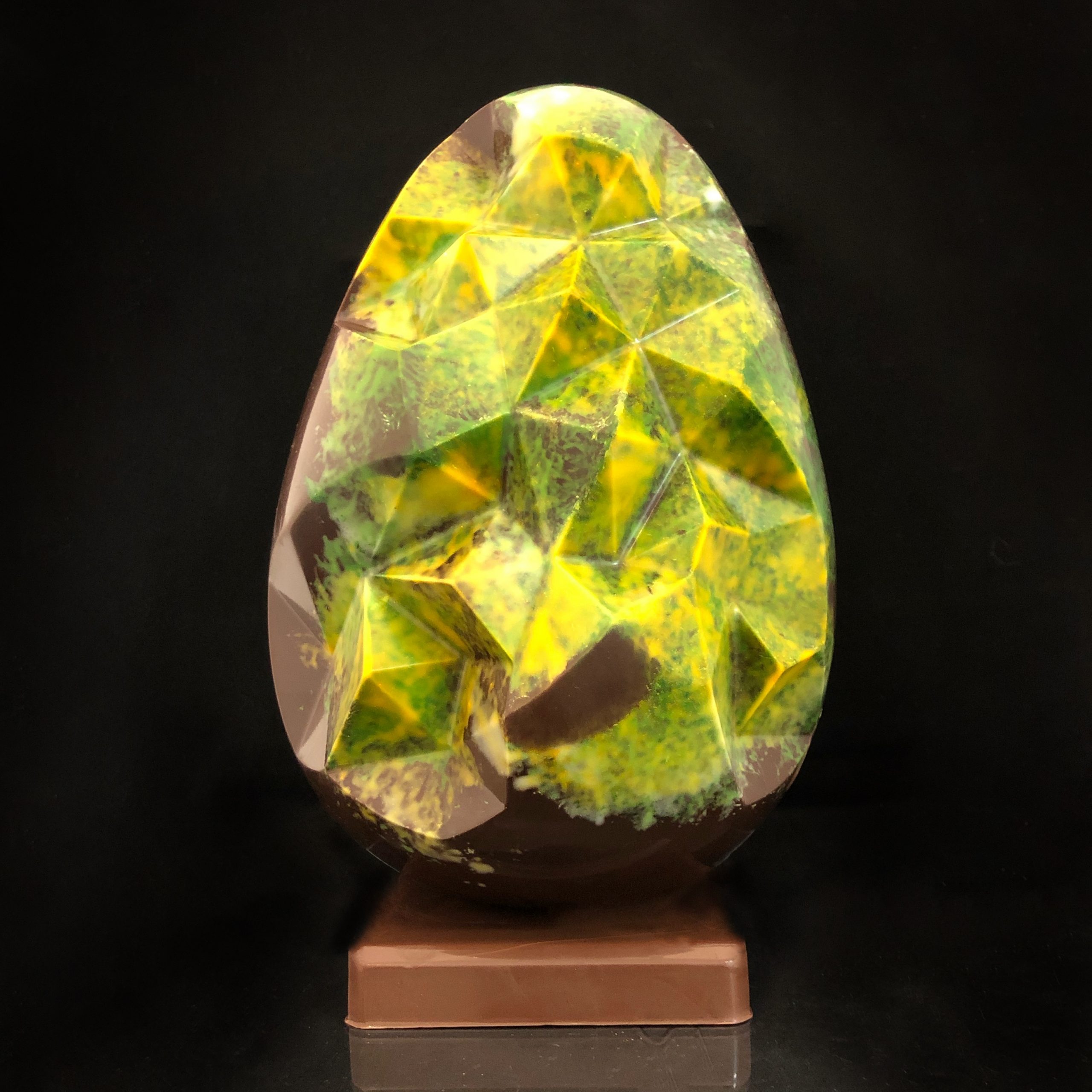 Cet œuf en chocolat, qu’il soit noir ou au lait, se transforme en une sculpture abstraite pleine de textures et de volumes. Les reliefs qui ornent sa surface sont conçus de manière à capturer la lumière, créant un jeu de contraste fascinant entre les ombres et les courbes. Chaque détail du design, chaque courbure et chaque arête, vient ajouter une dimension nouvelle à ce chocolat delicieux. Ce n’est pas un œuf traditionnel, mais une création artistique qui repousse les limites de la gourmandise pour en faire un véritable objet d’art. L’aspect géométrique de la pièce est dû au lignes nettes et formes organiques.