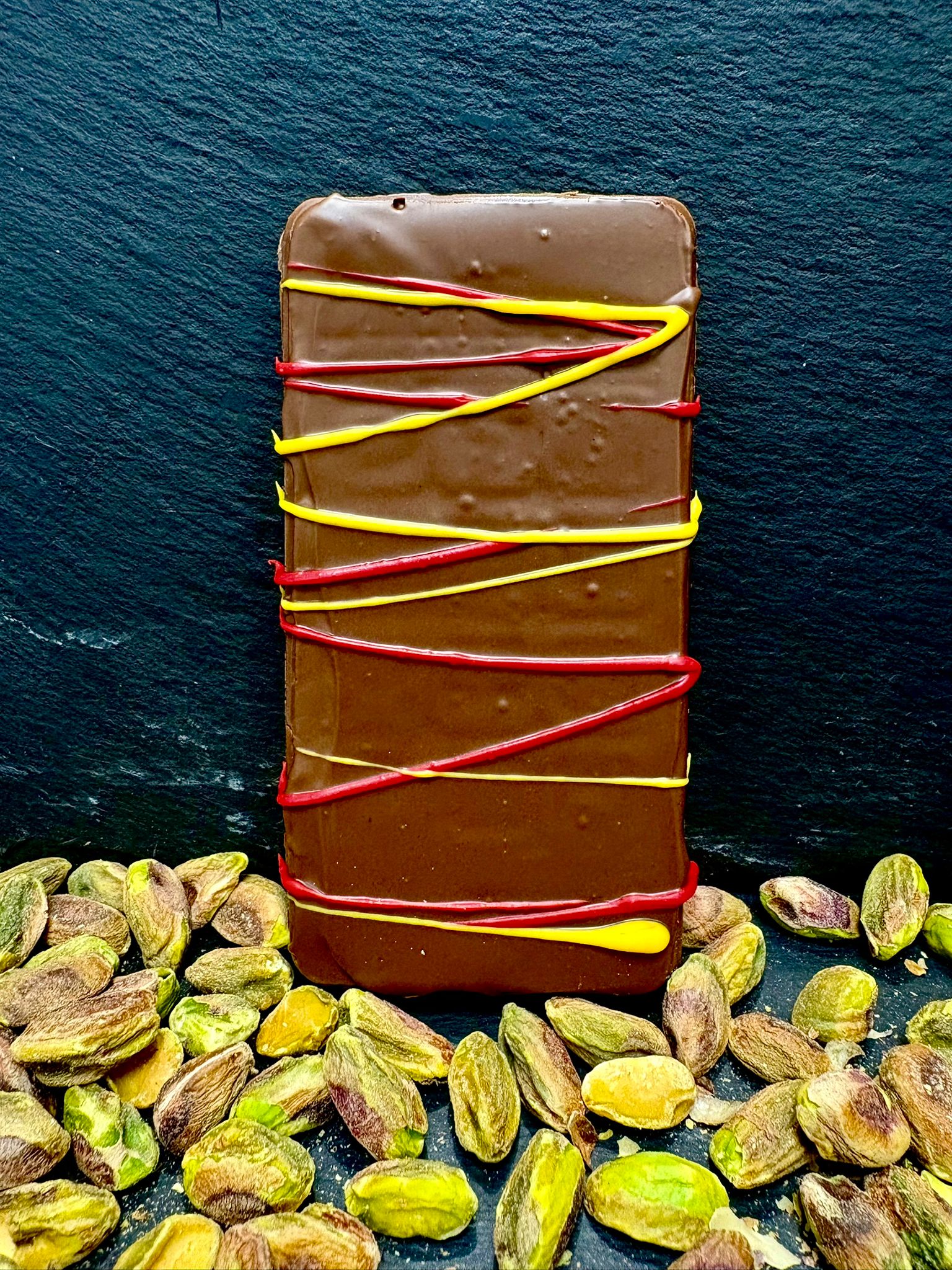 Craquez pour l’élégance orientale avec notre tablette Dubaï au chocolat au lait. Découvrez une création unique, signée Alexis Monod. Vous serez séduit par sa douceur et son exotisme. Chaque carré allie la richesse d’un chocolat au lait fondant à la puissance d’une pistache croquante. Le tout relevé par une touche sucrée-salée irrésistible.